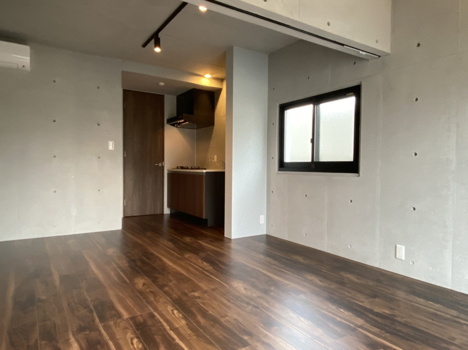 広々とした居室スペースとシックなブラウン色の床が印象的です。