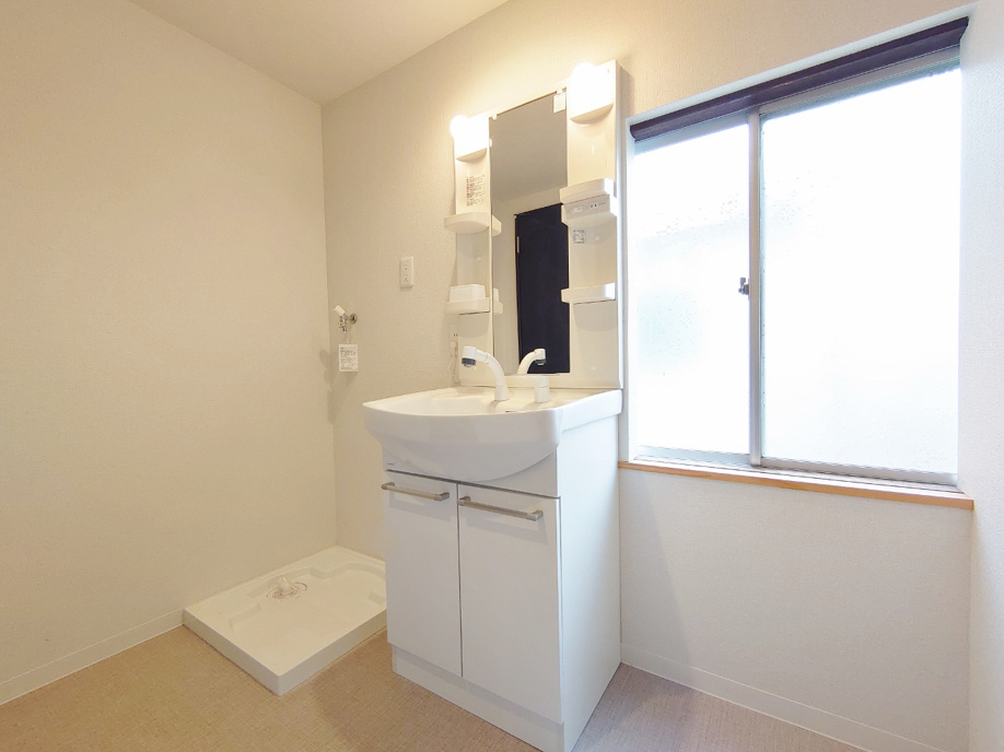 洗面所には、シャンプードレッサーとドラム式洗濯機も置ける室内洗濯機置き場となっております。