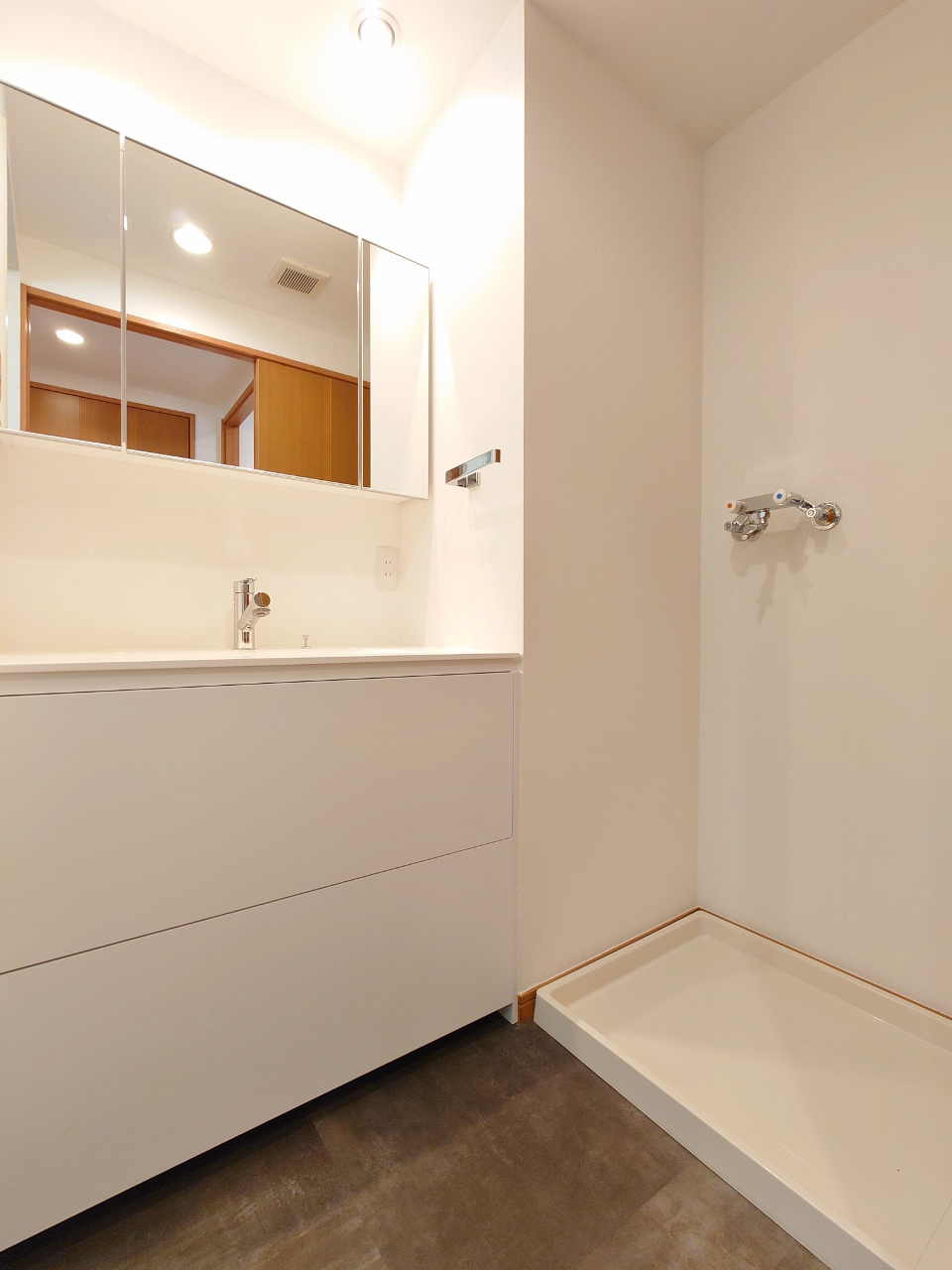 洗面所は、ドラム式洗濯機も置ける室内洗濯機置き場に三面鏡の独立洗面台です。