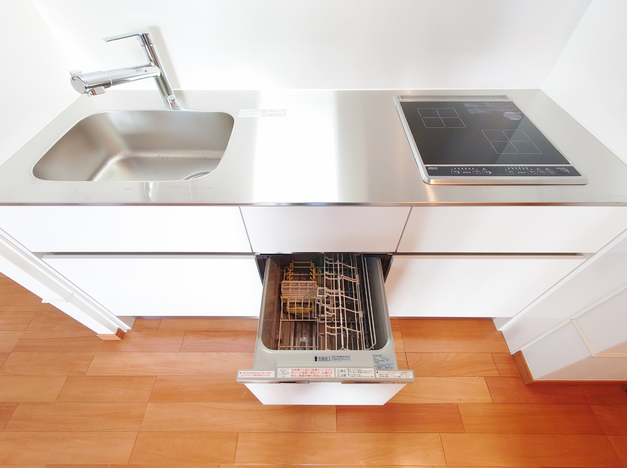 スタイリッシュなワンハンドルシングルレバーにIH2口コンロ付きに食洗器が付いたシステムキッチンです。