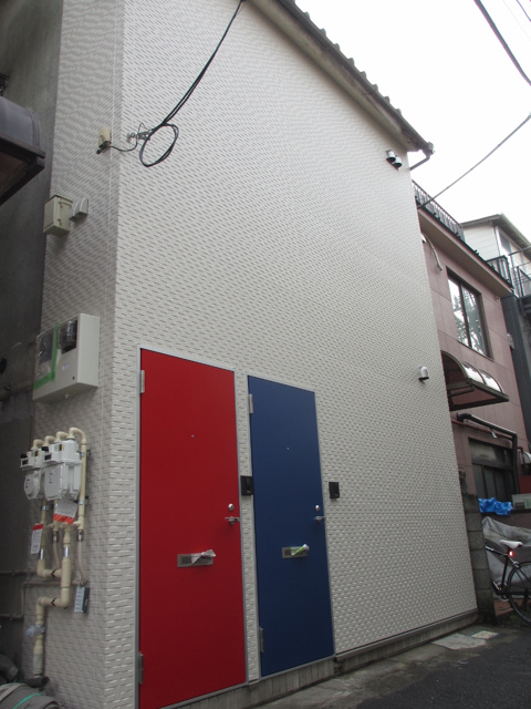 白い外観に、パステル調の赤と青の玄関扉になります。