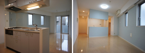 カウンターキッチンの大型ワンルーム ブルーのアクセントクロスが綺麗です!