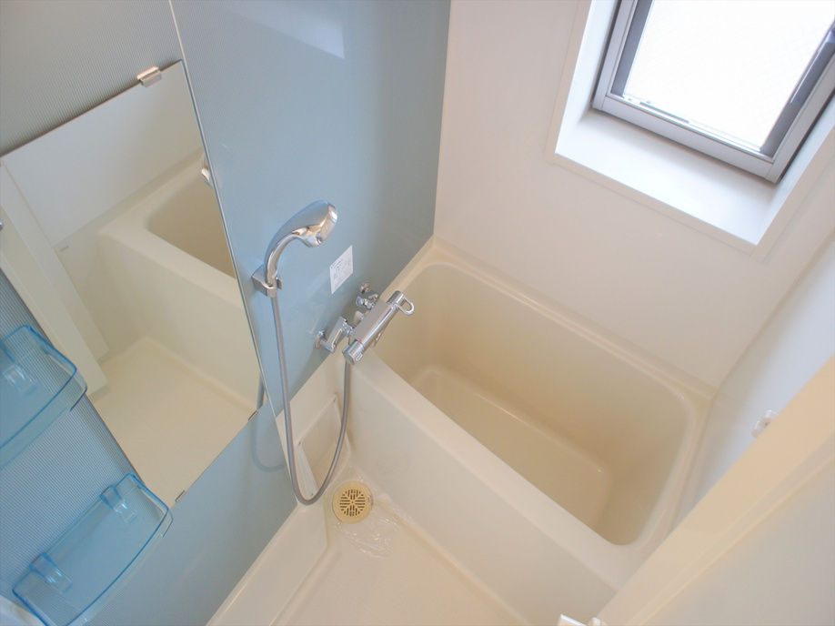 お風呂場も水色基調で窓もきちんとついているので、とてもいいですね。
