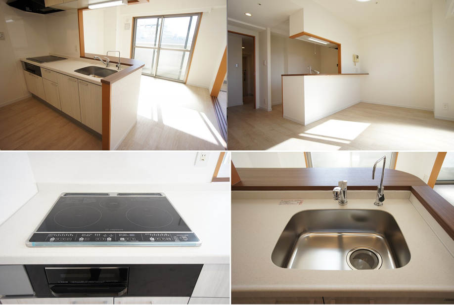 対面型カウンターキッチンは、グリル付3口IHコンロ、ビルトイン浄水器を設定しています。