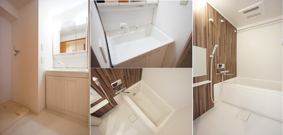 独立洗面台は、シャワー水栓、大きなミラー収納があり水廻りをすっきり綺麗に保てます。バスルームは、追い焚き、浴室乾燥機を完備しています。
